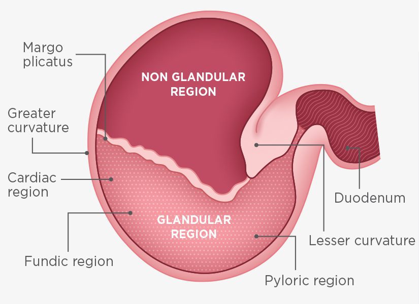 Glandular – the bottom of the stomach which holds the stomach acid.